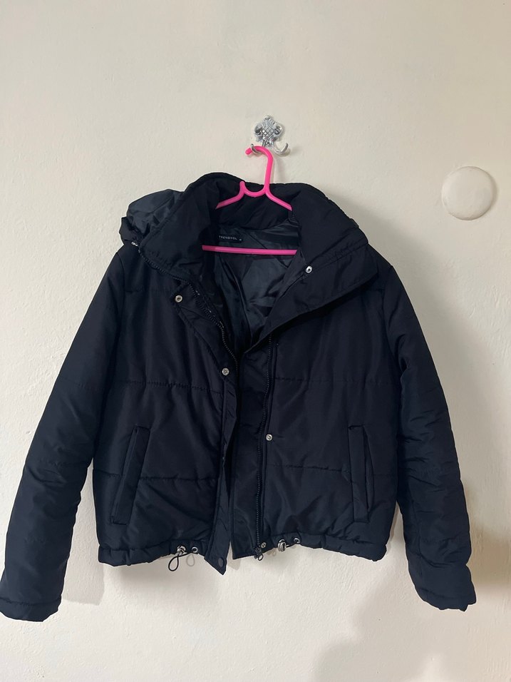 Düğmeli, yakalı ve siyah renkli kadın kışlık mont. İnce kesimi ve strappy kollu tasarımı ile outdoor kullanıma uygun.