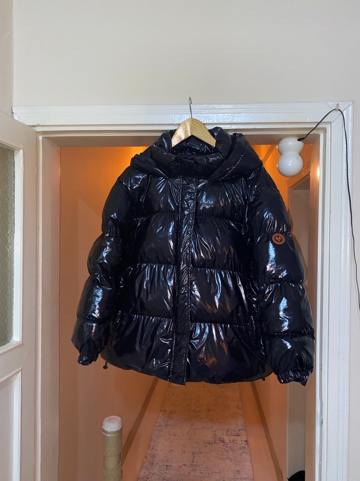 Düğmeli, yüksek yakalı siyah kadın kışlık mont, parlak görünümlü, askılı kollu ve normal midi boyda. Günlük sokak modası için uygun.