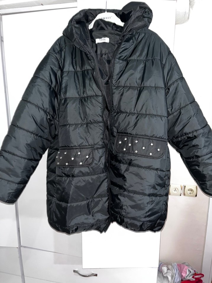 Siyah renk, düğmeli kısa kadın kışlık mont. Sentetik kumaştan üretilmiş, bol kesim ve notched lapel yakaya sahip. Ceplerde metal süslemeler bulunur. 42-44-46 beden için uygundur hiçvir defosu yoktur
