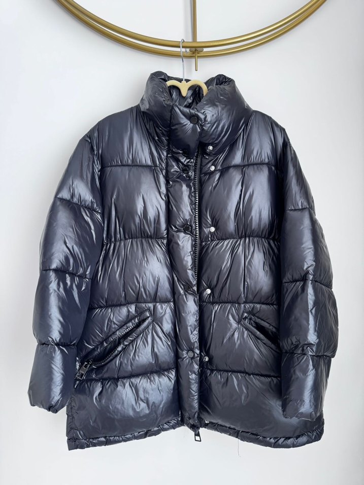 Düğmeli, fermuarlı yüksek yakalı siyah kışlık mont. Salaş kesim ve askılı kollarıyla rahat sokak tarzı sağlar. Midi boy ve desensiz tasarımla günlük kullanıma uygundur.