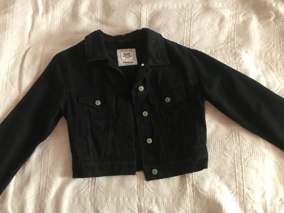 Düğmeli, siyah denim kot ceket. Notlu yaka, uzun kollu, bol kesim ve normal boyda. Günlük sokak stiline uygun.