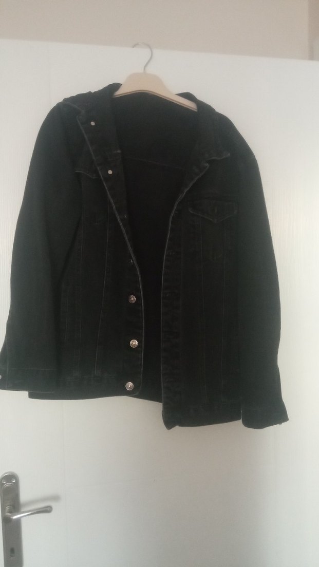 Siyah renkli, düğmeli, uzun kollu ve normal boyda bol kesim kadın kot ceketi. Günlük rahat kullanıma uygundur. beden küçük ama salaştır