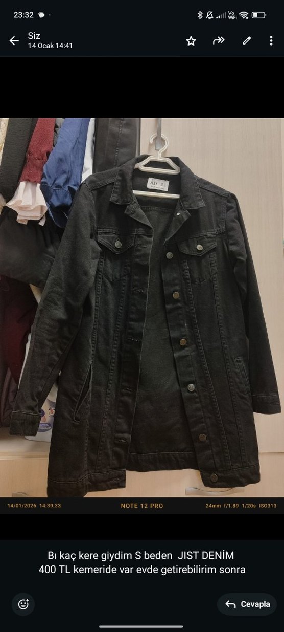 Siyah kot kumaştan yapılmış, düğmeli ve yakalı uzun kollu kadın ceket. Rahat kesimiyle günlük sokak stiline uygun.