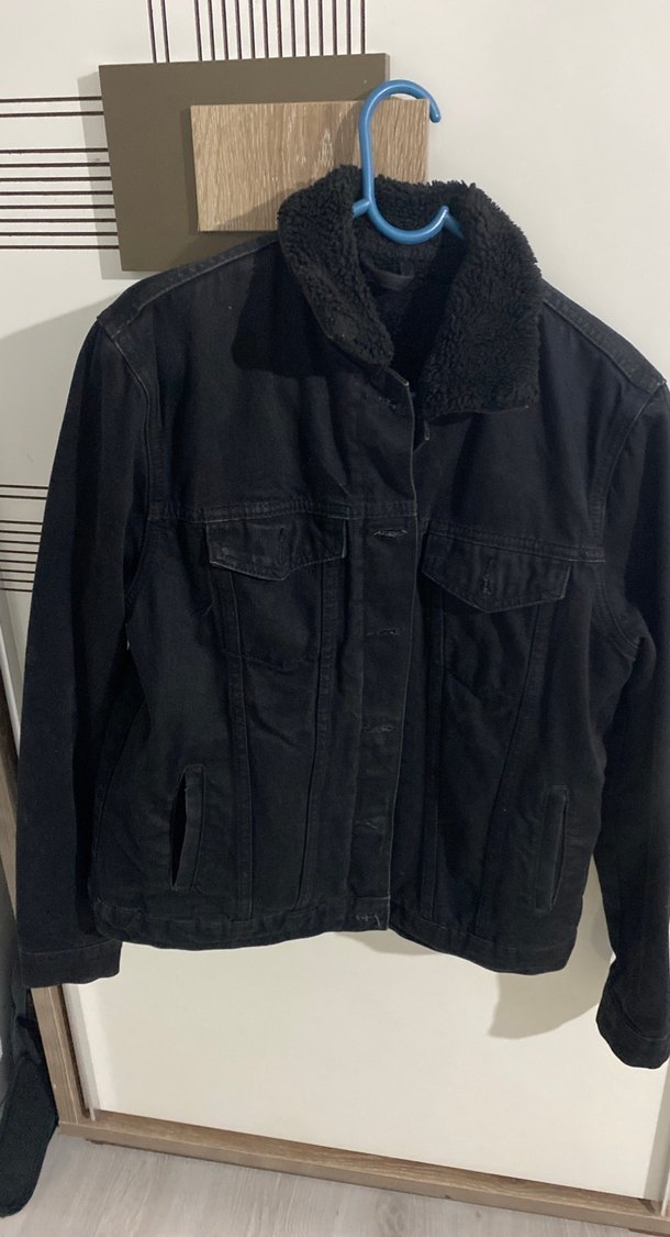 Siyah kot ceketin düğmeli kapaması, yumuşak tüylü yakası ve cep detayları vardır. Salaş kesimi ve uzun kollarıyla gündelik sokak tarzına uygundur.