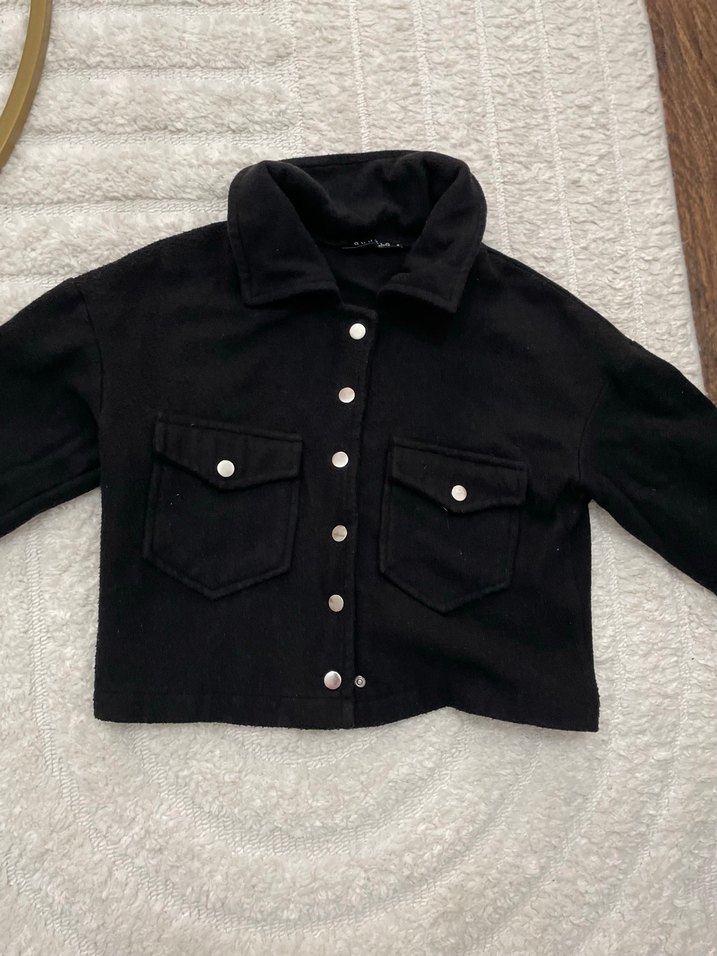 Siyah, düğmeli kadın kot ceket, uzun kollu ve kesik yakalıdır. Rahat kesim ve normal midi boyda, yumuşak kumaştan üretilmiştir, günlük sokak giyimine uygundur.
