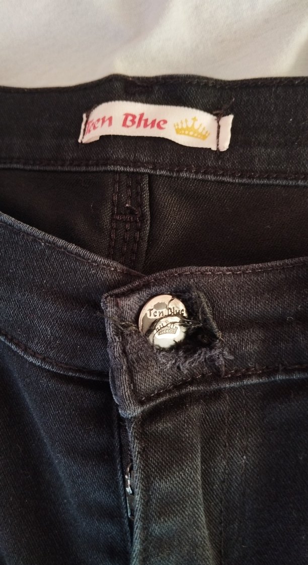 Siyah denimden yapılmış, düğmeli ve parlak görünümlü, normal boyda, dar kesim kadın kot pantolon. Günlük ve normcore tarza uygundur. Marka: Ten Blue