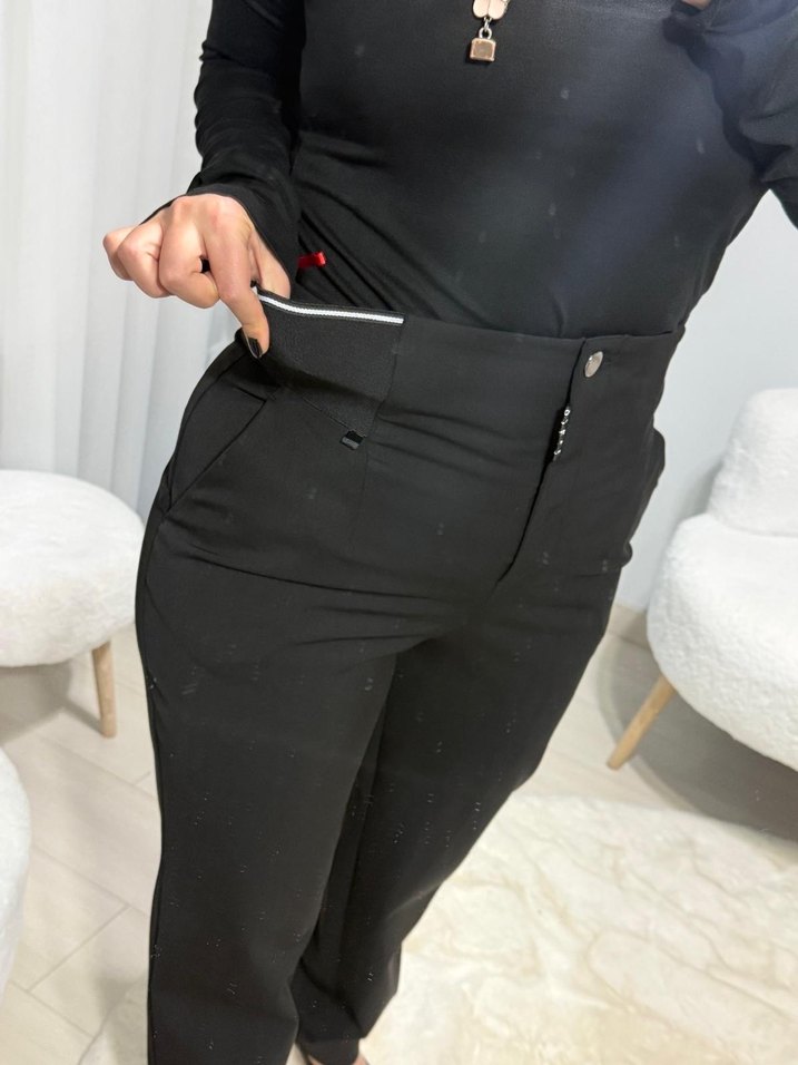 Siyah, düğmeli, regular fit kadın kumaş pantolon. Sentetik kumaştan üretilmiş, midi boy ve ofis ile günlük sokak stiline uygundur. Küçük beden 36/42 beden mevcuttur