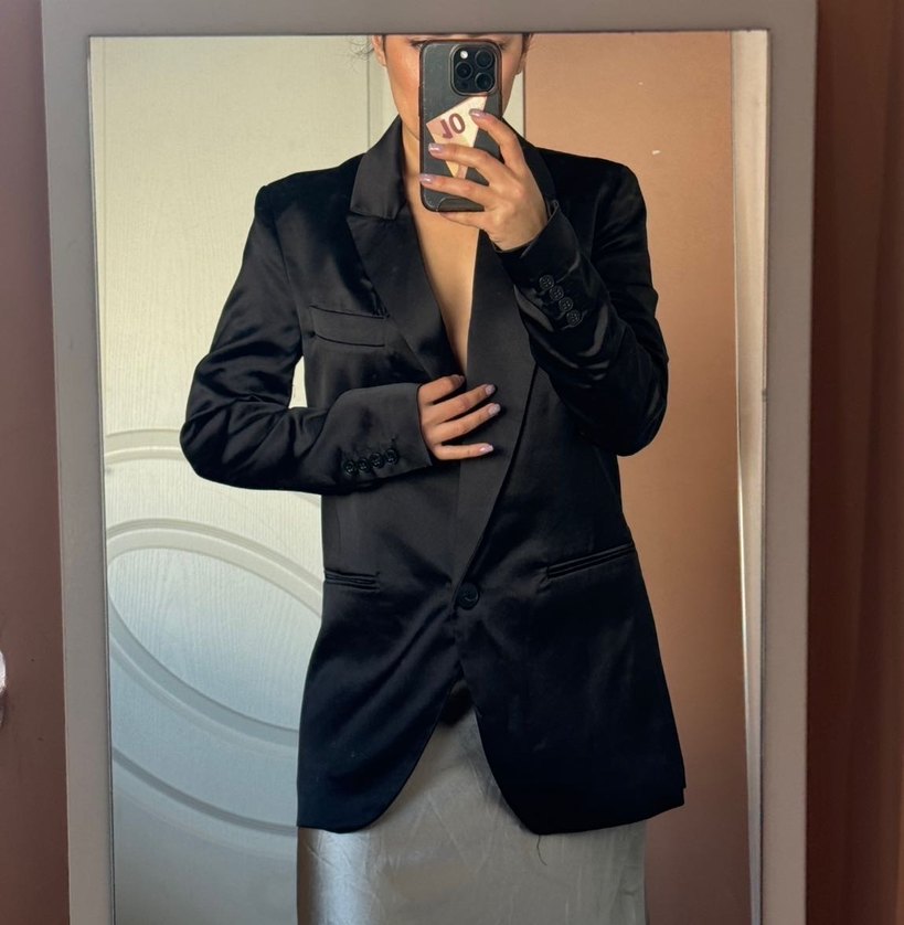 Yeni, iade yok. Siyah, düğmeli midi blazer. Uzun kollu, satenimsi kumaştan, normal kesim ve yaka detaylı.