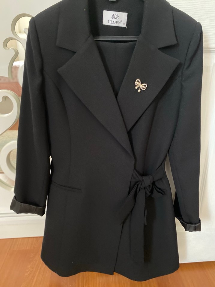 Siyah, düğmeli, saten dokulu kadın blazer ceket. TakimmmStrappy kollu, normal uzunlukta ve klasik şıklık için uygun. 1 kere kız istemesinde giyildi bi kaç yerine ufak tefek maytap yanıkları var gözlü görülecek kadar degil.