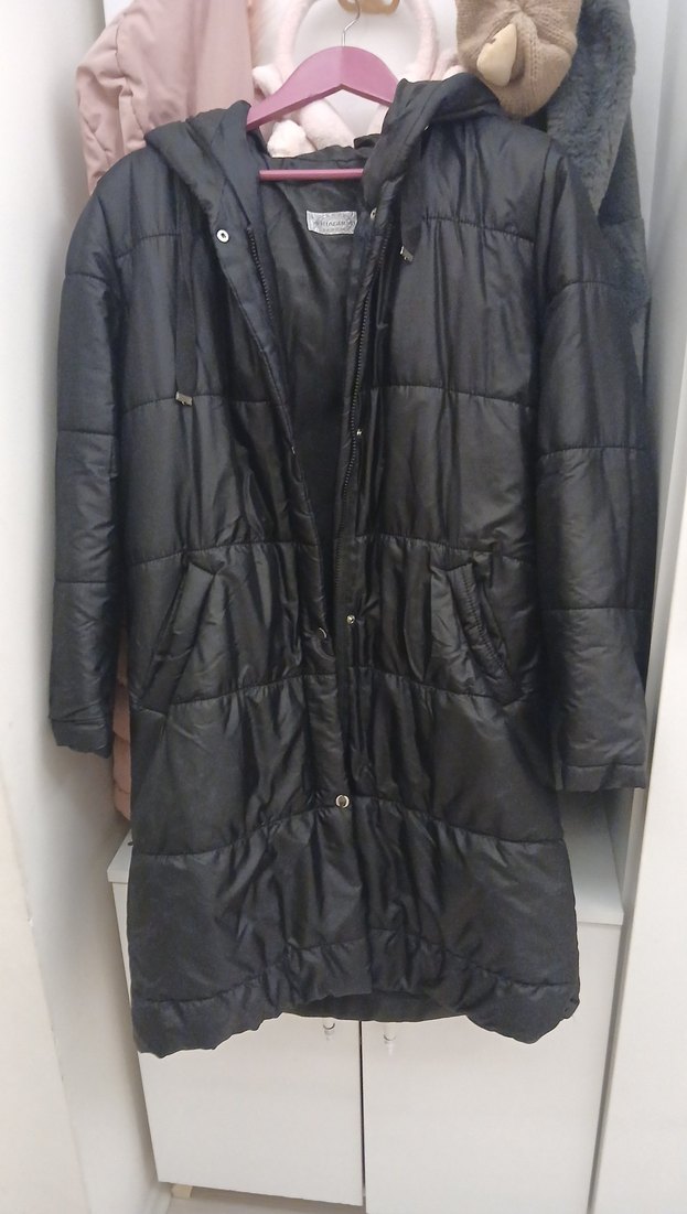 Siyah, düğmeli ve kruvaze yakalı kadın kışlık mont. Uzun kollu, midi boyda ve yumuşak, sıcak tutan kumaştan yapılmıştır. Günlük rahat sokak stili için uygundur.