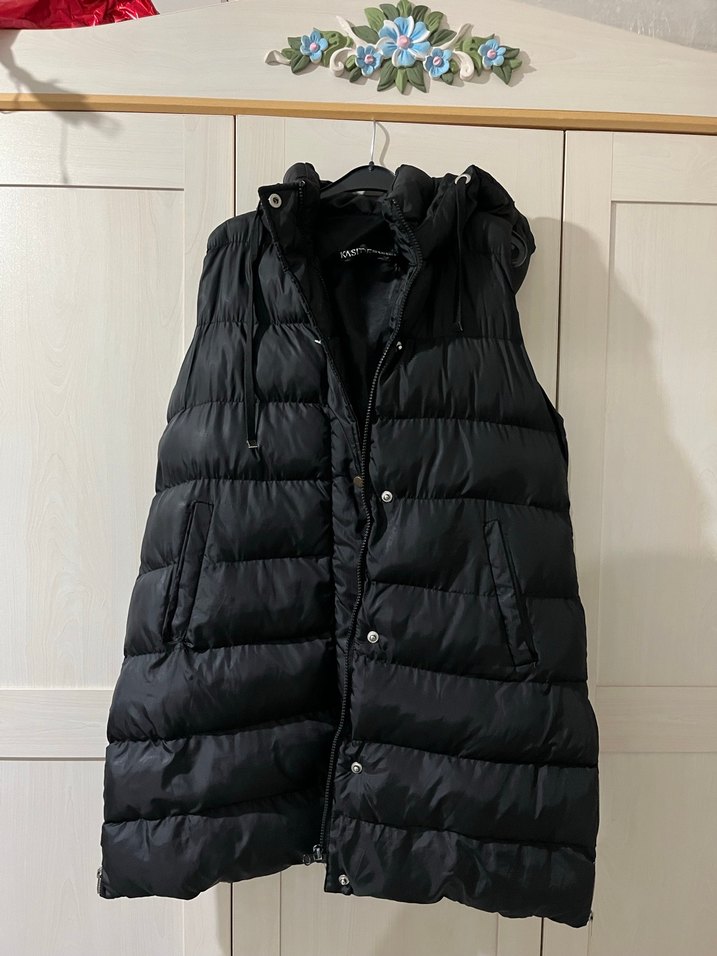 Siyah renkli, düğmeli ve yüksek yakalı kolsuz yelek. Rahat ve sıcak dokusuyla günlük kullanıma uygundur.