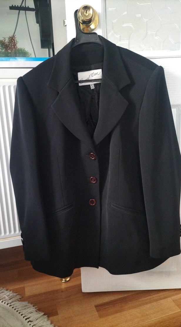 Siyah, düğmeli, uzun kollu kadın blazeri. Normal boy ve regular fit, ofis için uygun, ipeksi dokuda, klasik goth tarzında.