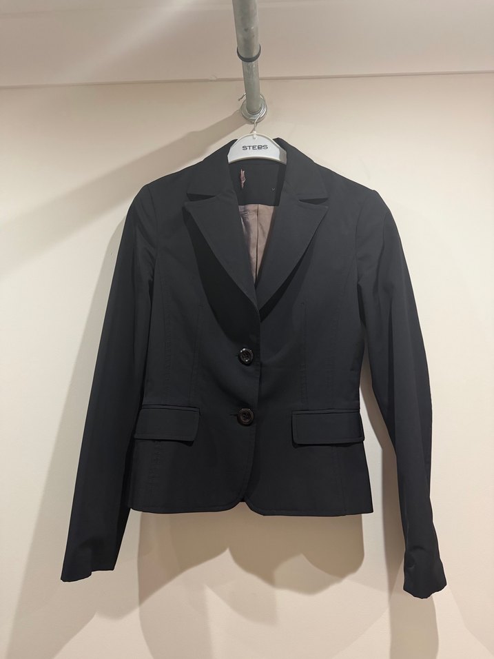 Siyah renkli, düğmeli ve keskin yaka detaylı kadın ofis blazeri. Uzun kollu, midi boyda ve rahat kesimdir. Modern klasik tarzda, sentetik kumaştan üretilmiştir.