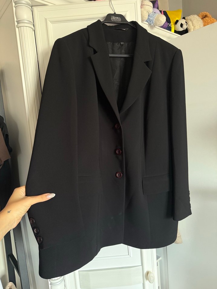 Siyah, düğmeli, uzun kollu kadın blazer. Düz, midi boyda, klasik ve şık goth tarzıyla ofis için ideal, ipeksi dokuda. 1 kere giydim