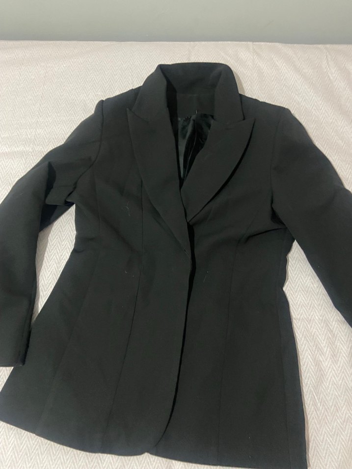 Siyah, düğmeli kadın blazer, keskin yaka ve uzun kollu. Normal kesim, midi boy ve sentetik kumaştan üretilmiştir. Ofis için goth tarzı şıklık sunar.