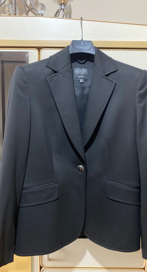 Siyah renkte, düğmeli, ipeksi kumaştan yapılmış kadın ofis blazeri. Normal midi boyunda, klasik modern tarzda, yakalı ve düğmeli, uzun kollu, sade desenli model.