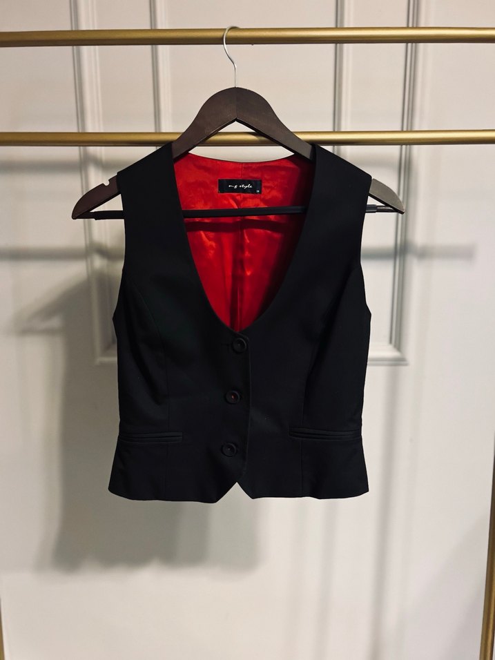 Düğmeli, yakalı ve vücuda oturan bu kadın yeleği, siyah parlak kumaştan, cesur goth tarzında ve ofis kullanımı için uygundur. İç kısmı kırmızı astarlıdır.