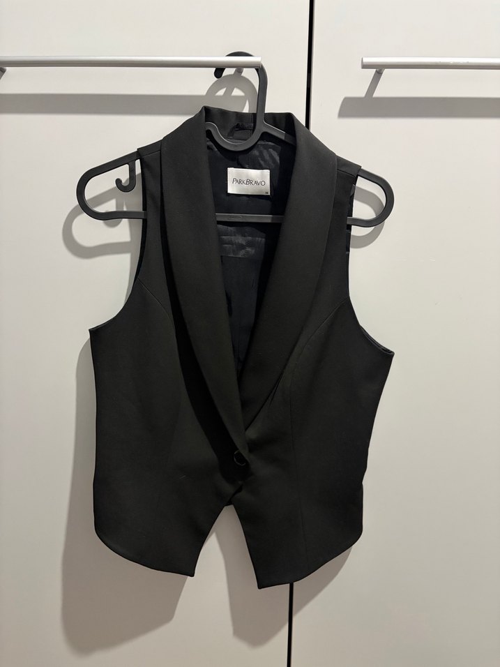 Siyah, düğmeli, yakalı ve kolsuz kadın yelek. İnce ve ipeksi kumaştan, ofis ve sokak stiline uygun.