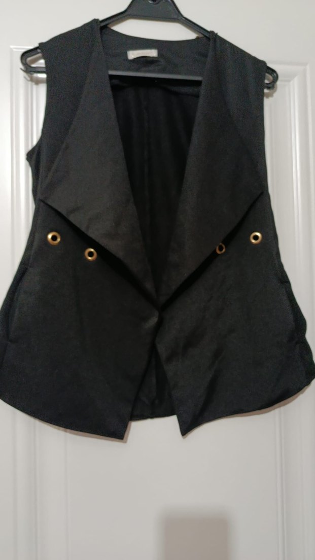 Siyah, düğmeli, yakalı ve kolsuz kadın yelek. Sentetik kumaştan, ofis için uygun şık kesim ve midi boyda.