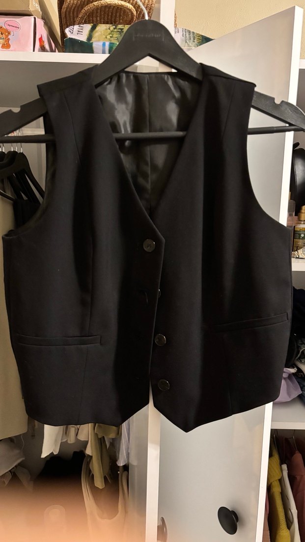 Düğmeli, siyah kadın yelek, keskin yakalı ve kolsuz. Düz, sentetik kumaştan, ofis için uygun, normal kesim.