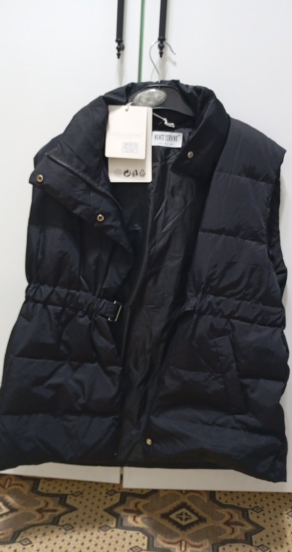 Siyah, düğmeli ve kolsuz kadın yeleği. Notlu yaka ve vücuda oturan kesimle, rahat ve sıcak bir kumaştan üretilmiştir.