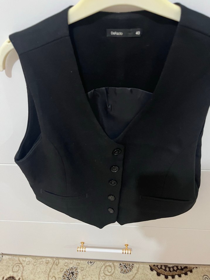 Siyah, düğmeli ve kolsuz kadın yelek. Normal uzunlukta, kesimi vücuda oturan, iş ortamına uygun şık bir parça. 3 defa tek giyildi
