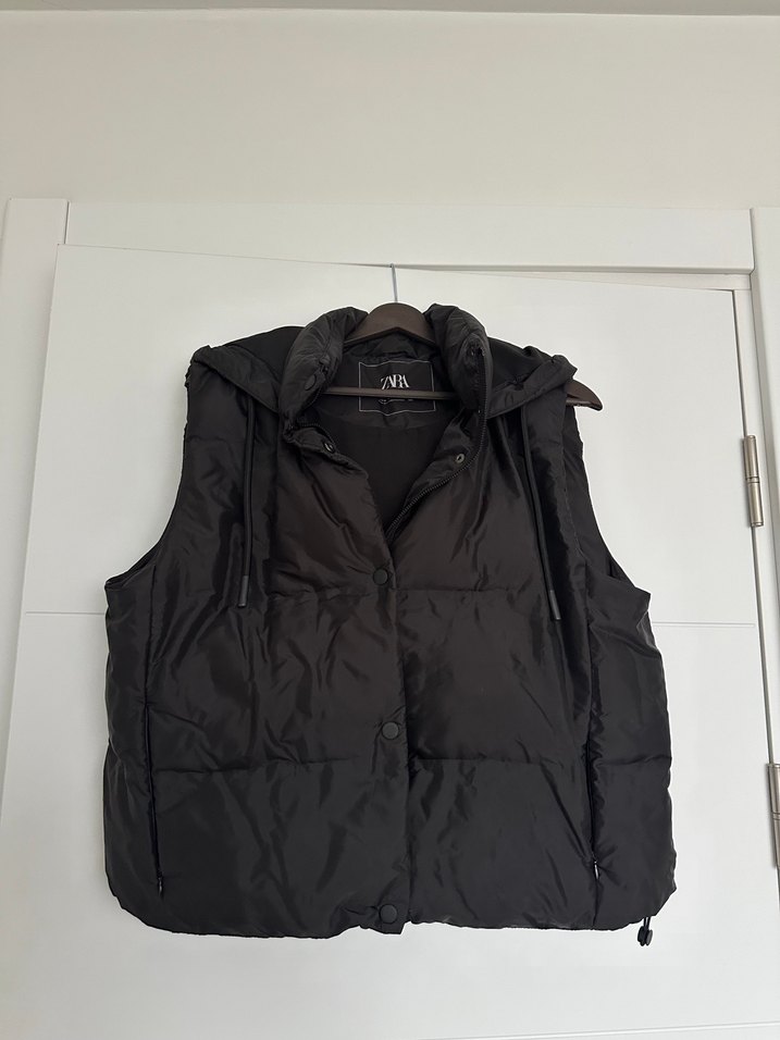 Düğmeli, kapüşonlu, yüksek yakalı siyah kadın yeleği. Rahat kesim ve yumuşak, sıcak kumaştan üretilmiştir.
