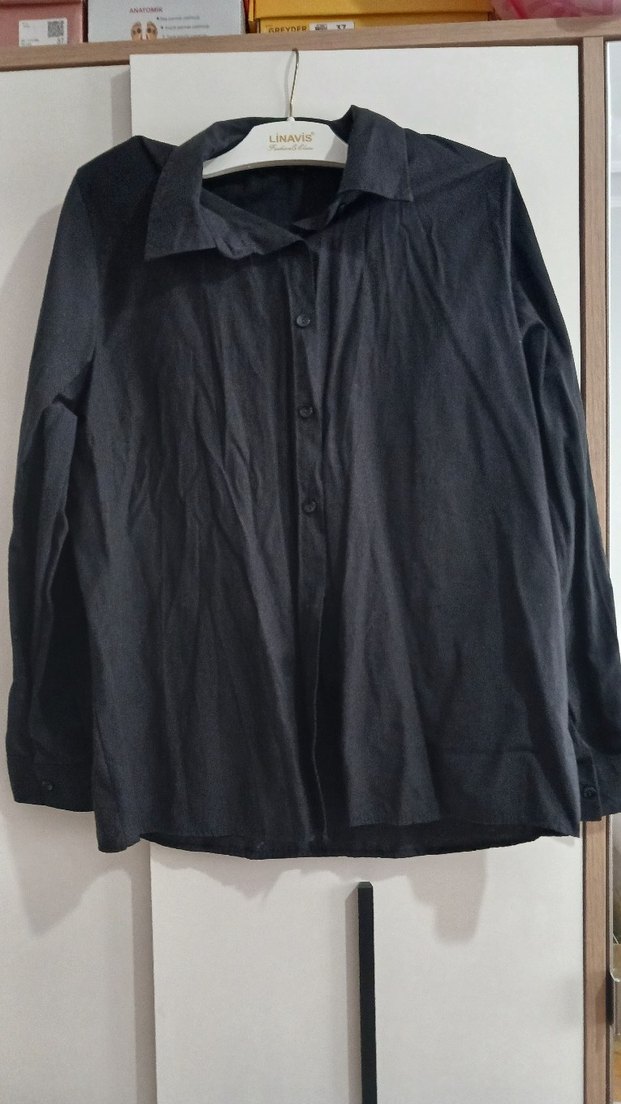Siyah keten kumaştan, düğmeli, yakası kesik ve uzun kollu kadın gömlek. Rahat kesimi ve midi boyu ile ofis kullanımı için uygundur.