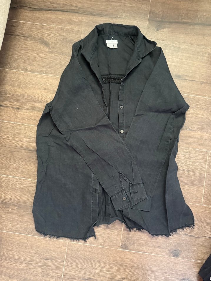Siyah keten gömlek, bol kesim, uzun kollu ve yaka detaylıdır. Düğmeli ve midi boyda, rahat sokak stiline uygundur.