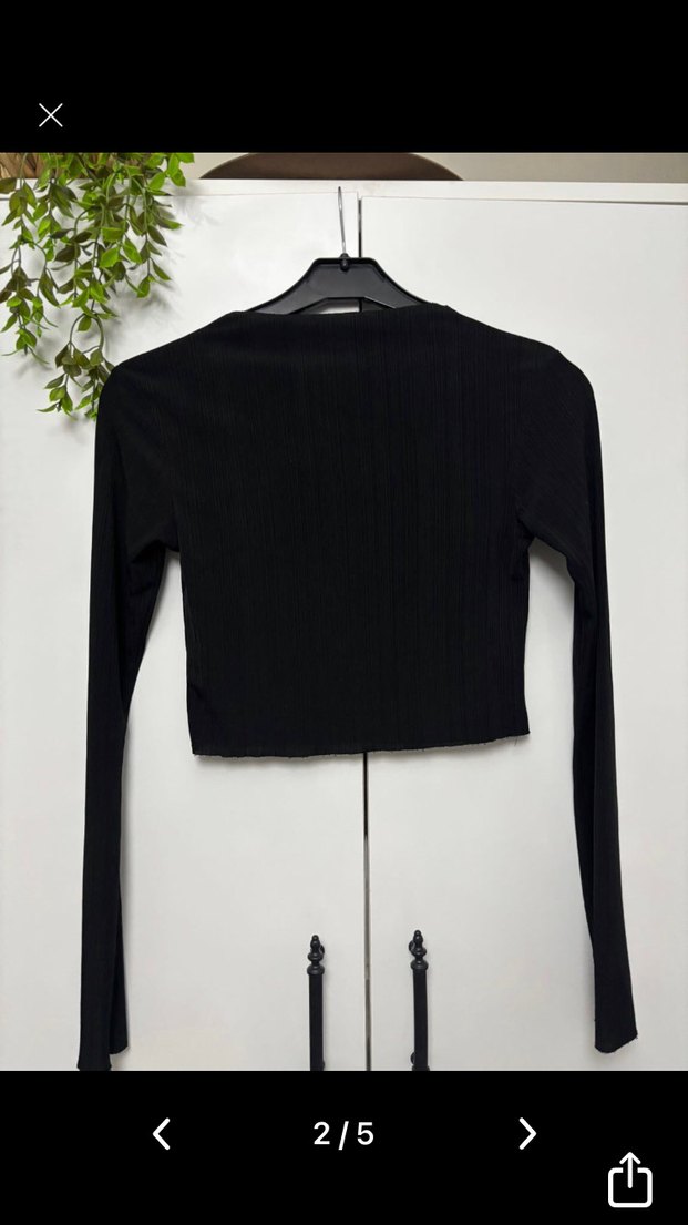 Siyah, uzun kollu ve düğmeli kısa kesim, vücuda oturan kadın bluz. Sentetik kumaştan, minimalist ve goth tarzına uygun günlük kullanım için.