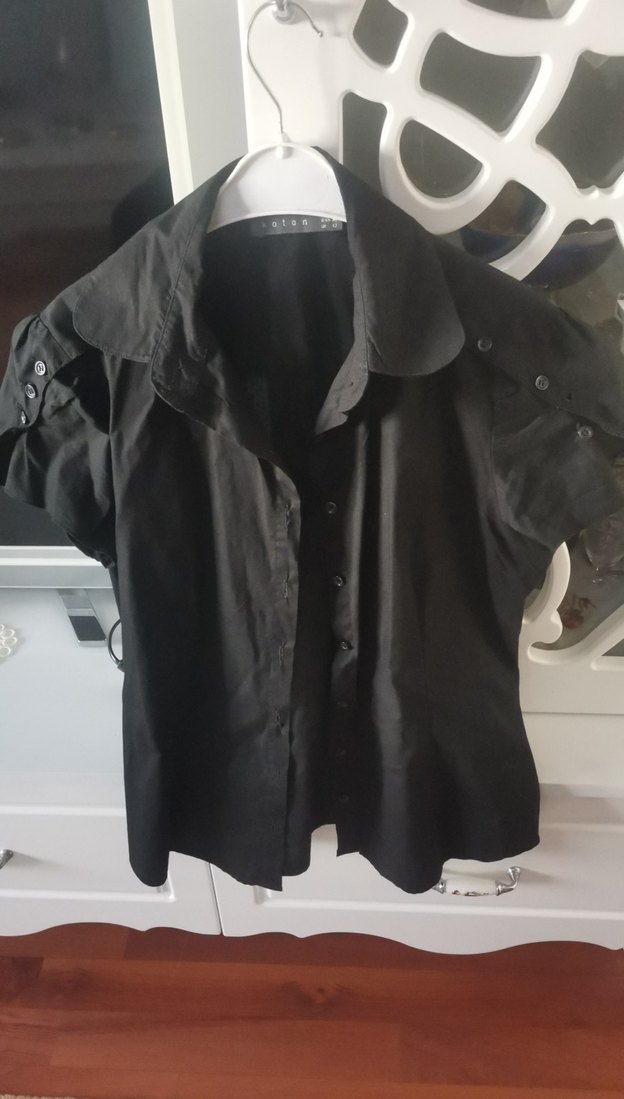 Siyah düğmeli, yakalı ve kısa kollu keten gömlek. Rahat kesimli ve normal boyda, gotik stil ve ofis kullanımı için uygun.