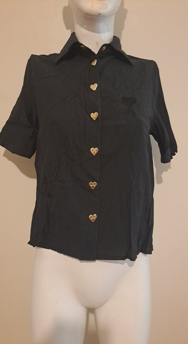 Siyah renkli, yakalı ve kısa kollu kadın gömleği. Düğmeleri kalp şeklinde ve hafif parlak, rahat kesim ve günlük kullanım için uygun.