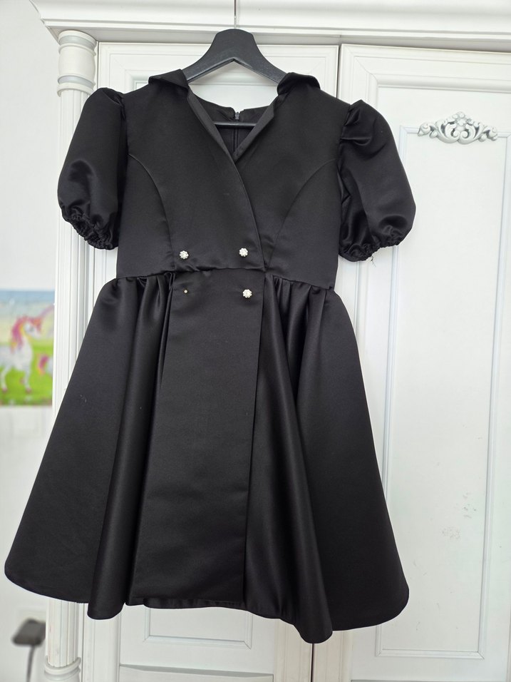Siyah parlak saten kumaştan, düğmeli, kısa kollu, bol kesim ve notched lapel yakalı gotik tarzda kız elbisesi. Tek düğmesi fotoğrafta da göründüğü gibi eksik.Musgem özel tasarım umay modeldir.