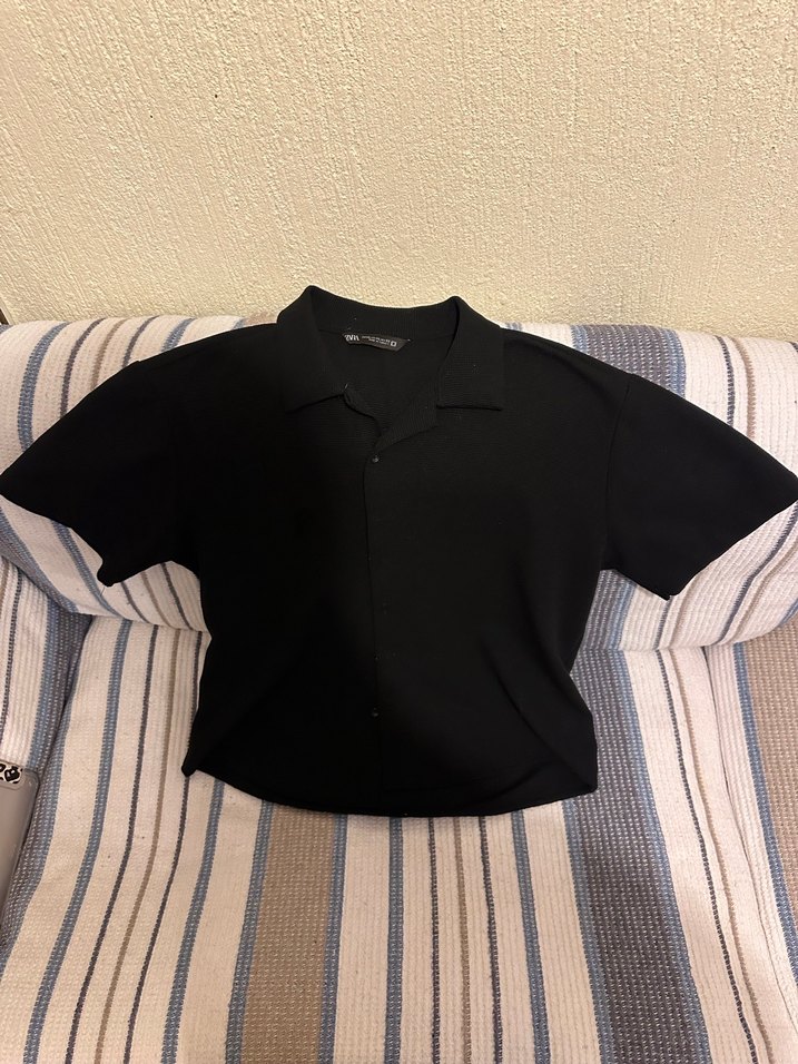 Düğmeli, kısa kollu, siyah polo tişört. Pamuklu kumaştan, rahat kesim ve normal boyda, günlük kullanıma uygun.
