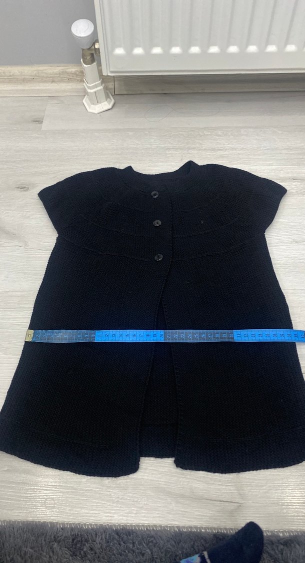 Siyah renkli, kısa kollu triko hırka, yuvarlak yaka ve normal midi boyda. Minimalist ve gotik tarzda, günlük kullanıma uygundur. Makina örgüsüdür ölçüleri belirttim