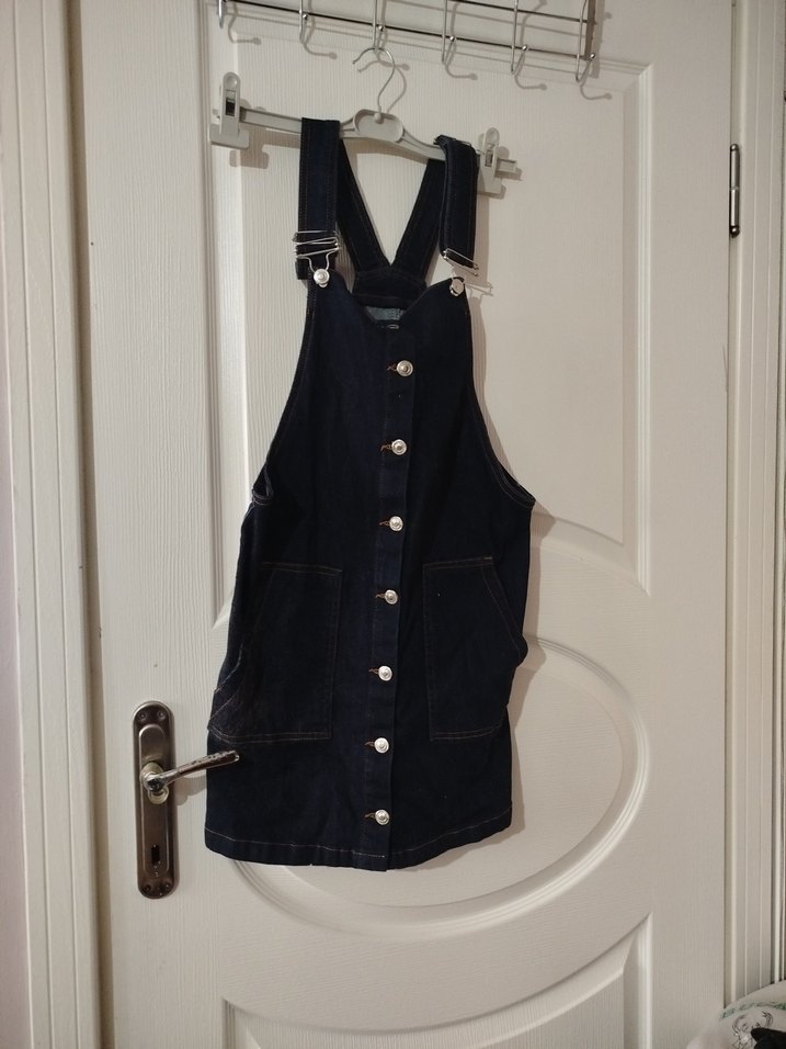 Düğmeli, yüksek yakalı, siyah kot kumaştan yapılmış, fitted kesim kısa tulum. Hiç giymedim