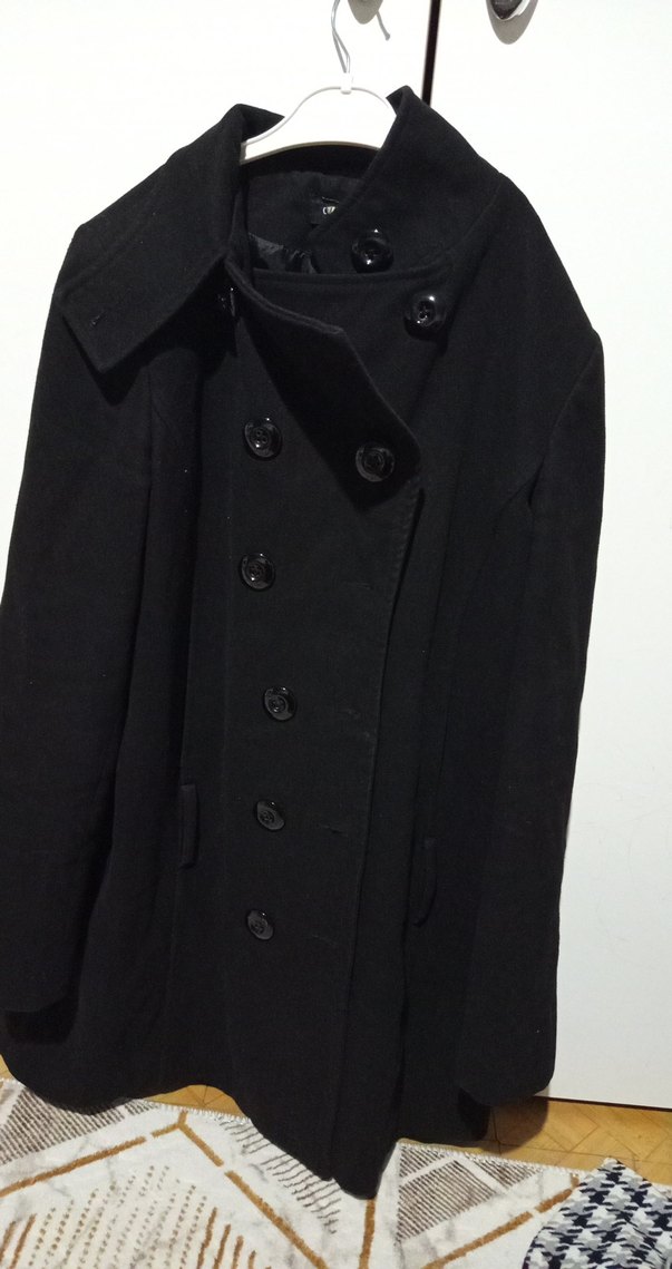 Siyah renkli, çift sıra düğmeli ve geniş yakalı kışlık kaban.