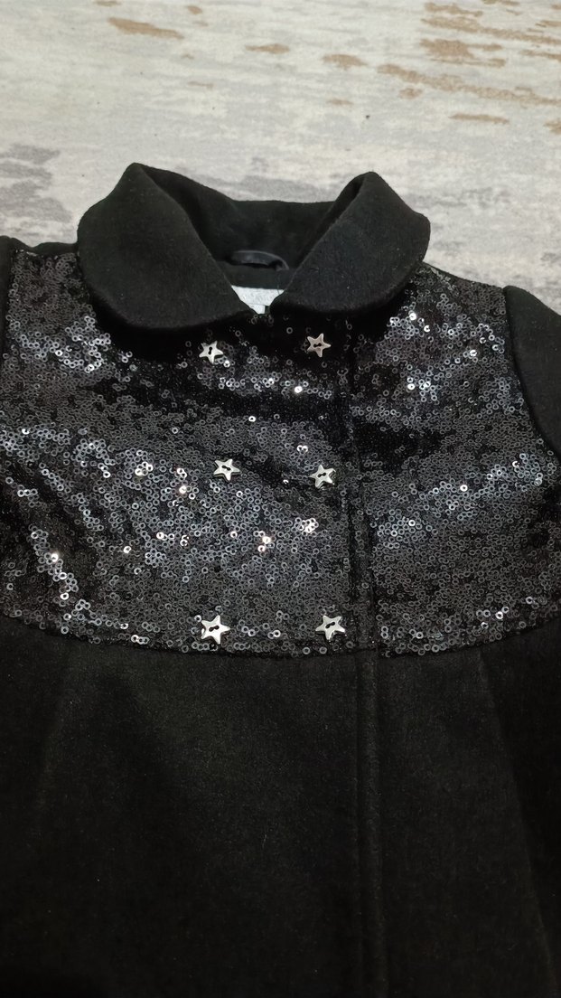 Düğmeli ve yumuşak dokulu siyah kız kabanı, klasik kesim ve payetli üst detaylarıyla şıklık katıyor. ✨