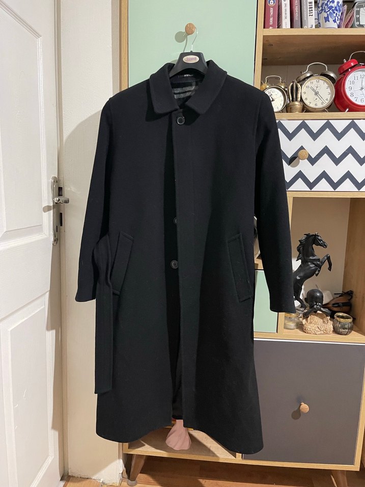 Siyah renkte, düğmeli ve iki ön cepli klasik erkek kaban. Zamansız ve kullanışlı bir dış giyim seçeneği 1 kere kullanıldı .