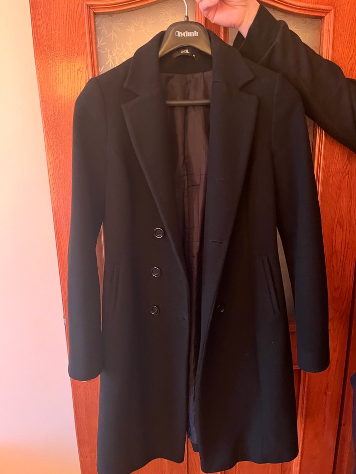 Siyah renkte, düğmeli klasik kesime sahip, astarlı ve yan cepli kaban.