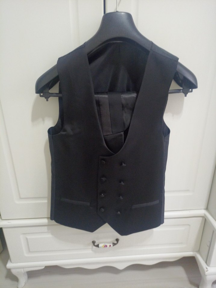 Siyah, düğmeli ve klasik kesim yaka detaylı, sentetik kumaştan yapılmış kolsuz yelek. İş ortamı için uygun midi boyda ve düzenli kesim.