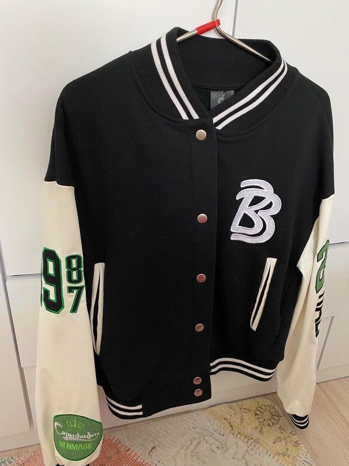 Düğmeli, uzun kollu ve bol kesim siyah kolaj ceket. Kollar deri ve göğüste baskılı detaylar, yuvarlak yaka tasarımı. Yumuşak ve sıcak kumaştan üretilmiştir.