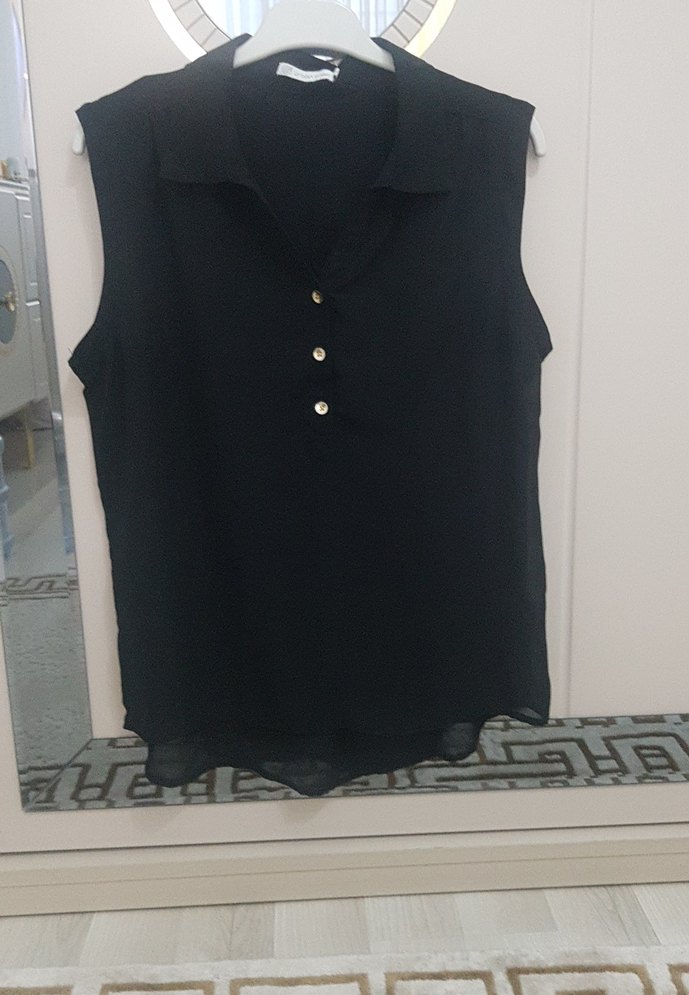Kolsuz, düğmeli ve yakalı siyah gömlek. Rahat kesimi ve normal boyuyla günlük sokak stiline uygun, yumuşak sentetik kumaştan yapılmıştır. krep kumas ic gosterir icine atlet giymeli