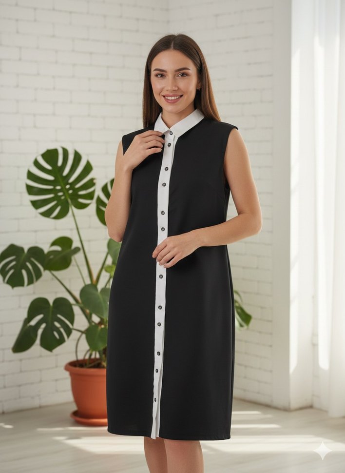 Pamuk kumaştan, beyaz yakalı ve düğmeli ön kısmı olan siyah kolsuz midi elbise. Ofis için uygun, rahat kesim. sm.ml bedenleri mevcuttur m.l beden ölcusu iki kolaltı 46cm boyları 96cm dir