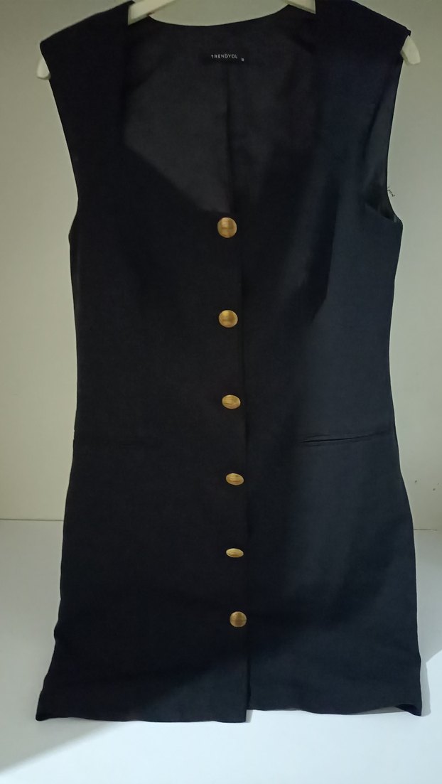 Siyah, kolsuz, düğmeli midi yelek. Notlu yaka ve düzenli kesimle iş ve trend ofis kullanımı için uygundur.