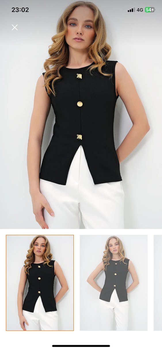 Kolsuz, triko siyah bluz, V yakalı ve dekoratif düğmeli. Ofis için uygun, kısa ve regular fit kesime sahip.