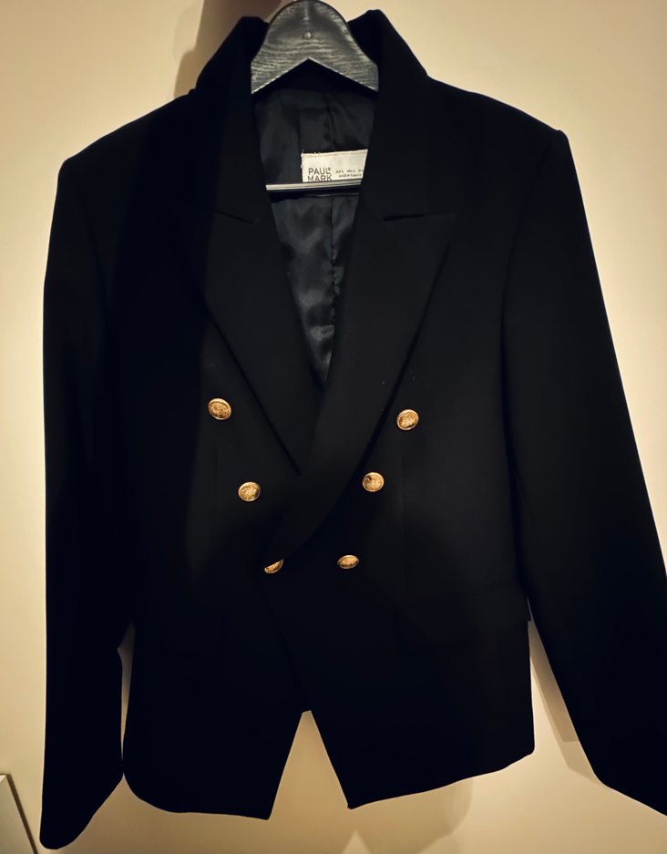 Siyah, düğmeli, ipek gibi dokulu kadın blazer ceket. Uzun kollu, normal kesim ve midi boyda, ofis için uygun klasik Paris tarzı. Large 38-40 beden için uygundur.