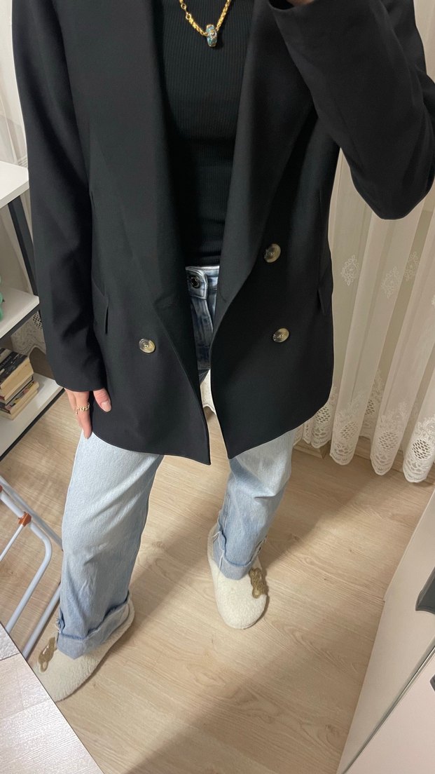 Siyah denim kumaştan, uzun kollu, düğmeli ve notched lapel yakalı midi uzunlukta bol kesim blazer. Günlük rahat kullanım için uygundur.