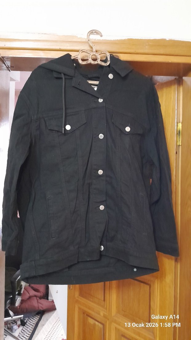 Siyah denim kumaştan, düğmeli ve notched yakalı, bol kesim midi uzunlukta ceket. Günlük rahat kullanıma uygun uzun kollu.mavi marka