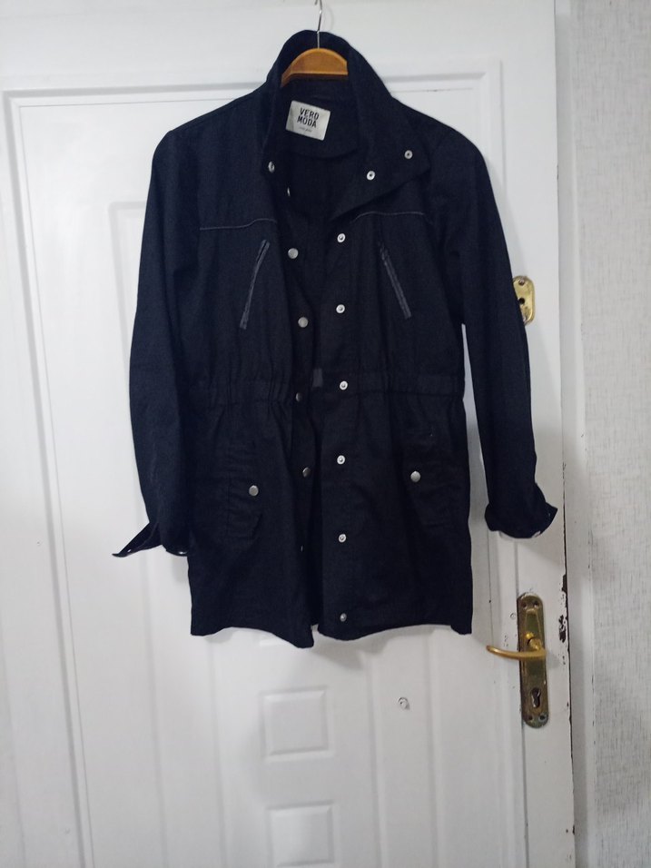Siyah renk, düğmeli, notched lapel yakalı, uzun kollu, midi boy, bol kesim denim kadın ceket.